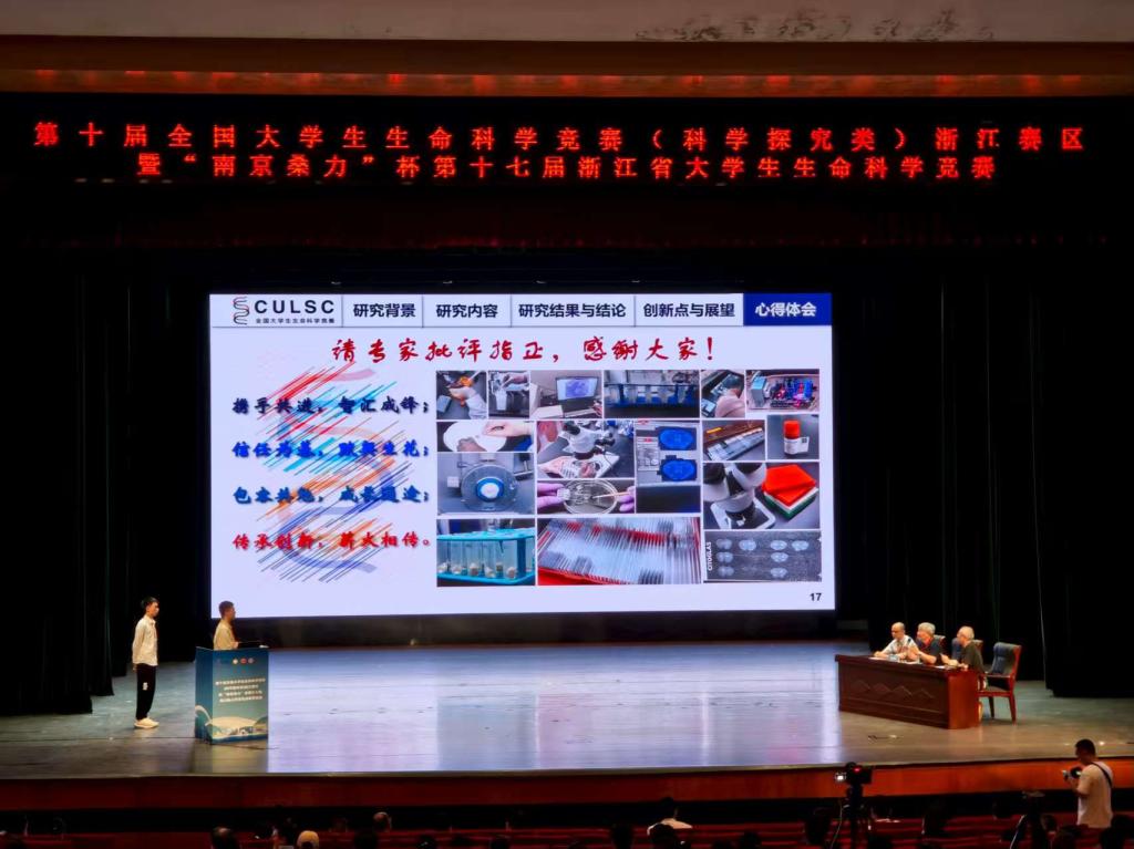 在浙江赛区闭幕式上,组委会特邀两支优秀队伍面向全体参赛师生进行展示与答辩。我校由张斌老师指导的学生团队(成员包括临床医学专业朱凯元、王梦赞、王雅婷同学,药学专业戴裕臻、程家琪同学)作为其中之一登台亮相。团队成员自信沉稳、逻辑清晰、思维敏捷,充分展现了城院学子的专业素养与良好风貌,赢得了专家和师生的一致好评。